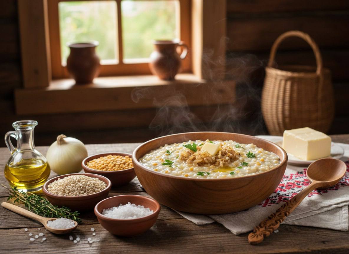 1,5 стакана ячневой крупы, 2 л воды, 0,25 стакана гороха, 1 луковица, 2 ст. ложки тимьяна или чабера, 3 ст. ложки сливочного или подсолнечного масла, 1 ч. ложка соли.