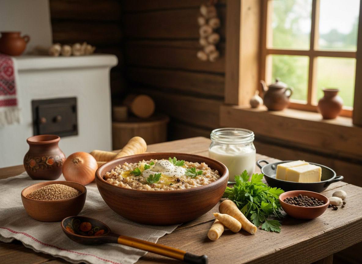 1,5 стакана мелкой гречневой крупы (продела), 1 л воды, 2 луковицы, 2 корня пастернака, 2-3 ст. ложки зелени петрушки, 1/2 ч. ложки черного молотого перца, 0,5 стакана сметаны, 2 ст. ложки топленого или сливочного масла, 1 ч. ложка соли.